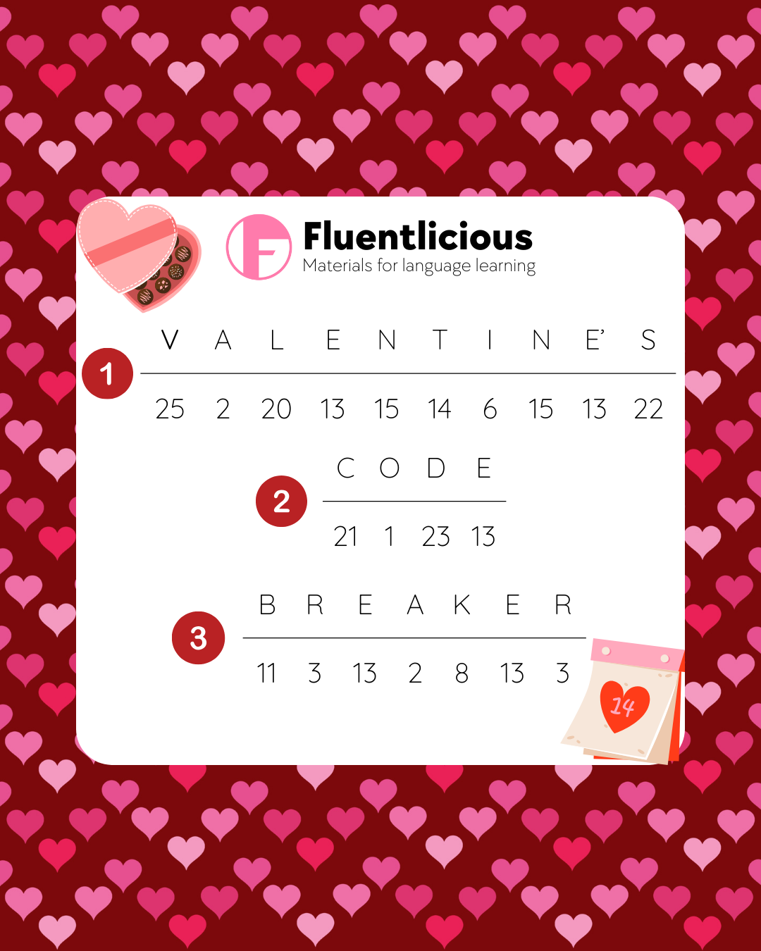 A fun Valentine’s Day Code Breaker worksheet for ESL learners. Students solve simple codes to practise Valentine’s vocabulary in an engaging, low-prep way.